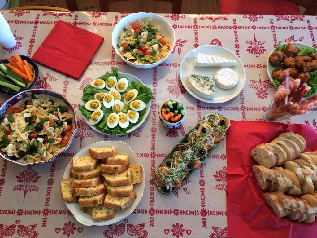 今回は、ケークサレ、フレンチミモザ、グリッシーニの生ハム巻き、フォアグラのパテ、パスタサラダ、チーズの盛り合わせ、ワカモレ、サーモン、そしてメインのチキン丸焼き(レーズンとパプリカご飯詰め)、を用意しました。