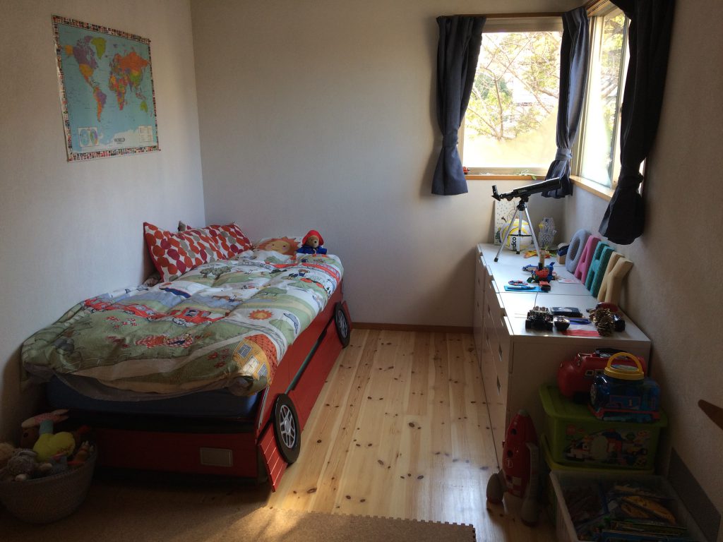 子供用のベッドはロンドンに越したばかりの頃にオンラインで購入。何か楽しげでかわいくて子供が喜びそうなもの、でも機能的でもあるもの、という観点から赤い車の形をしたベッドに決めた!実は下のタイヤの部分が引き出しのようになっていて、中にはもう一人用のマットレスが隠されているのだ。なので、少々段差はあるものの、横にならべてぼくちんたちが寝られる!