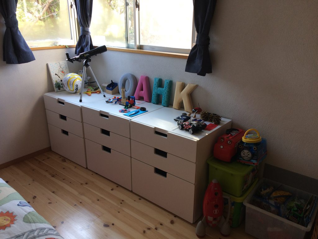子供用の洋服棚はIKEAのもの。子供部屋はやはりIKEAがおすすめ!さすが北欧なだけあり、カラフルで何とも子供心をくすぐるかわいいデザインのものが多い。色は、大きな家具の場合は、白なら間違いなくどこでも合わせられるので安心して購入できる。そしてまた、家具を選ぶときに気をつけているのは、あまり背の高い家具を部屋に入れないということ。地震の際のリスクももちろんのこと、背の高い家具は部屋が狭く見えるし、圧迫感があるから。なので、なるべく背が低く、横に長い家具を選ぶように心がけている。