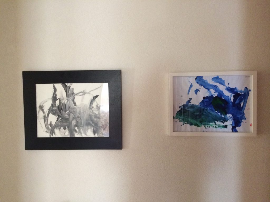ソファーの上の壁の絵はママンが高校生の頃に書いた油絵。玄関から入った廊下の壁に飾ってあるのは、お兄ちんとちいさなぼくちんがそれぞれ2歳の頃に書いたぐちゃぐちゃアート。