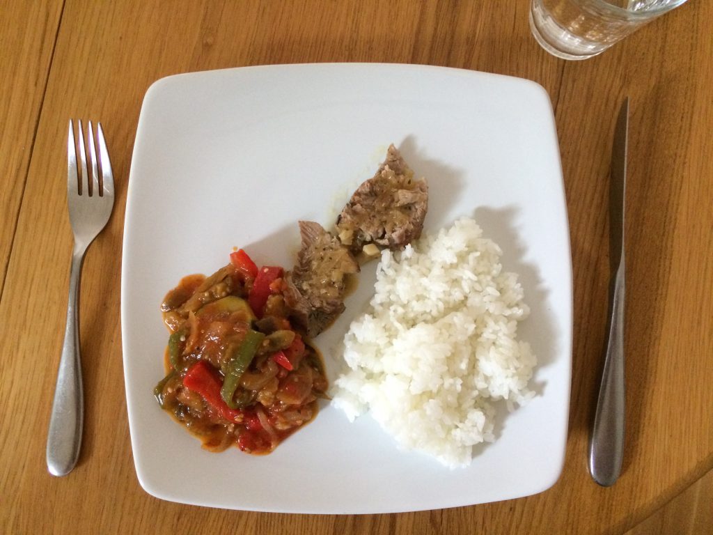 結局うちのぼくちんたちも含めて下の公園で小一時間ほど遊んでてもらうことにし、ちゃちゃっと掃除を済ませ、ランチ作りに専念。その日は夏野菜でラタトゥイユと豚のヒレ肉の白ワイン煮を作りました!これは夫のおばあちゃんから教えてもらったフレンチの家庭料理。