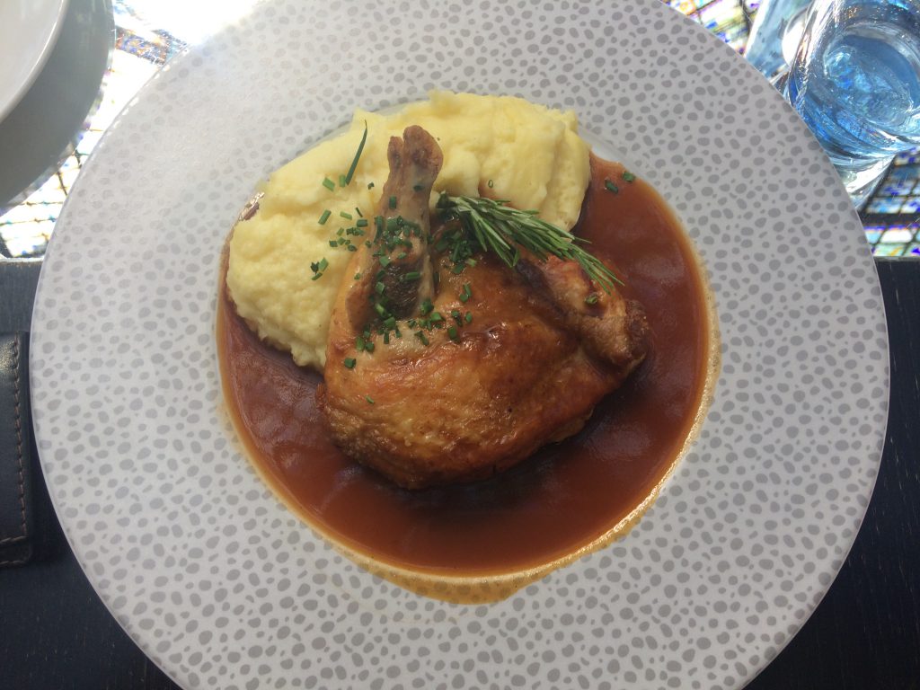 メインは”今日のメニュー”ということでチキンをいただきました。お皿や盛り付けは美しいけれど、味は、まあ普通においしい、という感じでした。それにしてもフランス料理は肉などのソースの味が深い!