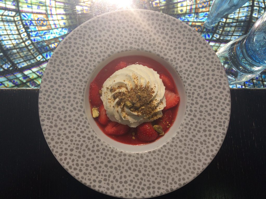 これが大正解!このフォンテンブローという名のデザート(いちごとクリームの盛り合わせピスタチオ付き)、かわいくて美味しくてたまりませんでした(笑)。