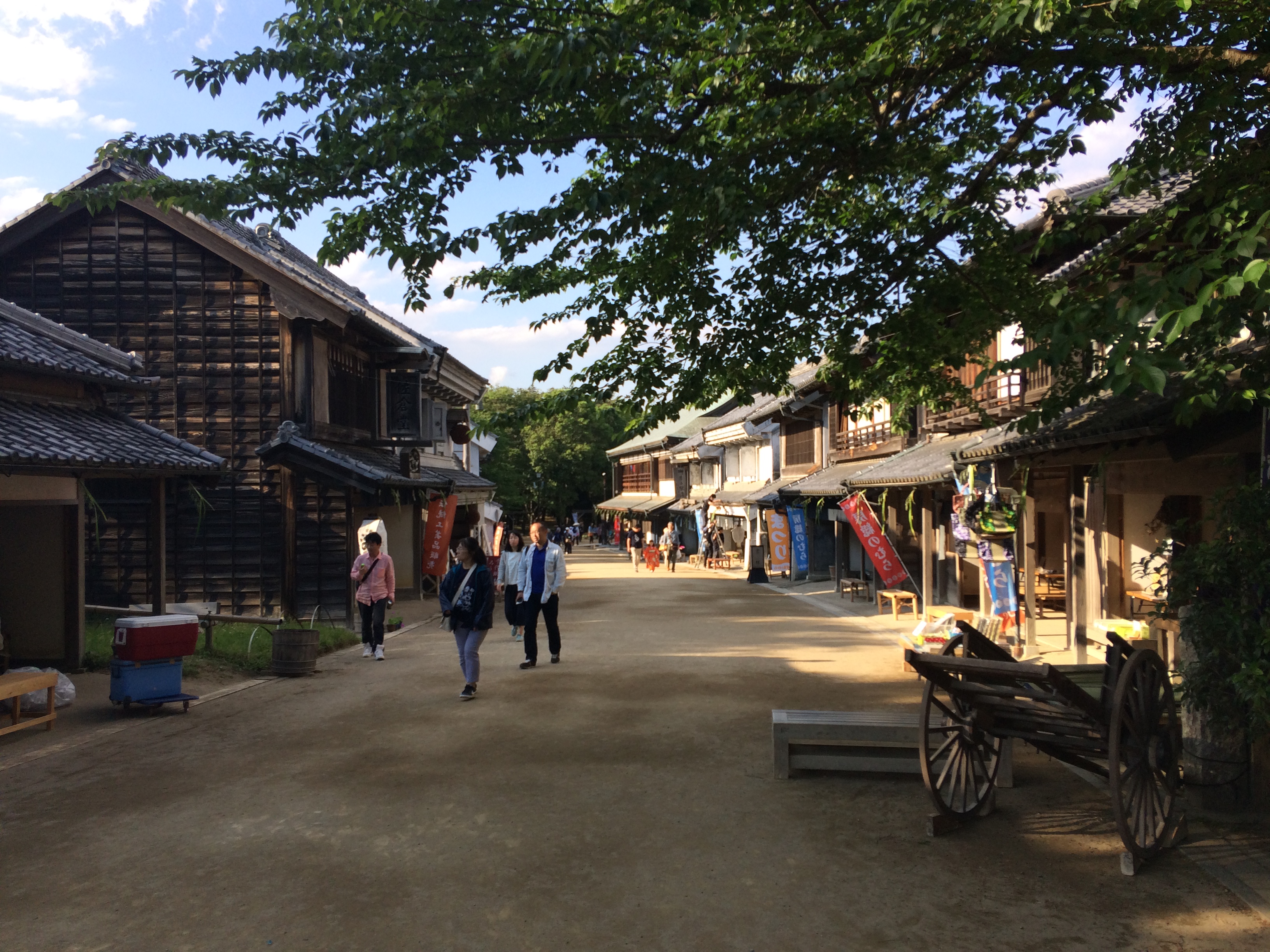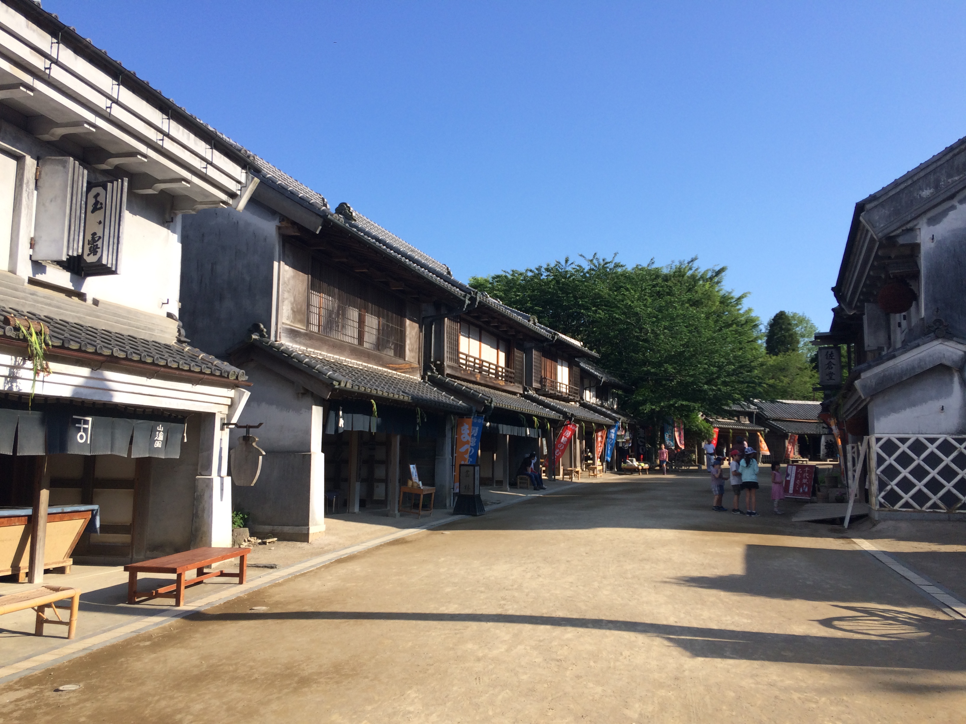 房総のむらでは、江戸の街並みの中、紙すきや竹とんぼ、風車作りなど、様々な体験学習を楽しむことができます。